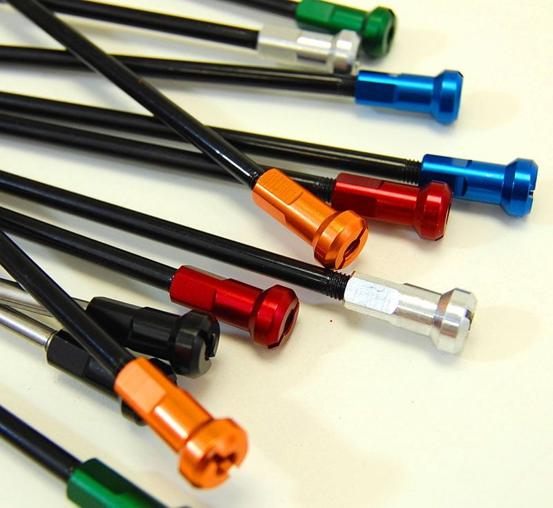 We tend to stick to black Sapim Alu spokes. They are light weight and build great wheels. But if you want coloured nipples to match your bike – our nipple suppliers can supply quite a range to suit your request.