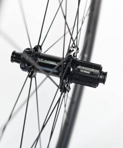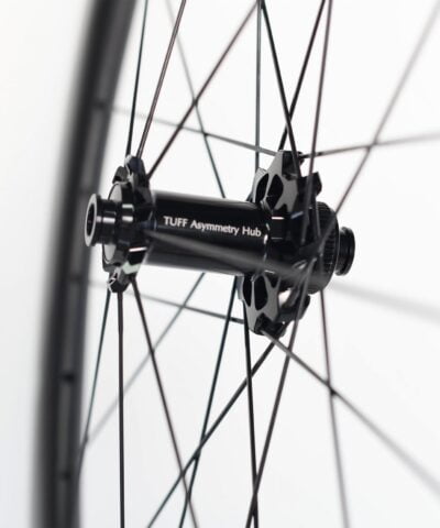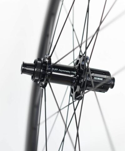 This enables an improved energy transfer. It also reduces the stress on the spokes on the right side and increases lateral stiffness.